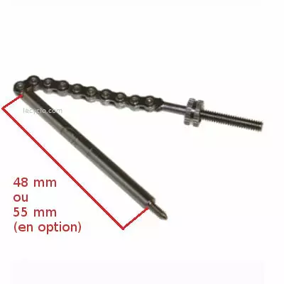 Cette chaînette fait partie de la transmission à vitesses intégrées Sturmey Archer pour moyeu 3 vitesses. Elle assure la bonne tension dans l’engrenage pour garantir un tirage et un changement de vitesse efficace. Après plus d’un siècle d’existence, la marque anglaise demeure la référence en terme de vitesses intégrées. Le bruit légendaire de ses cliquets en a fait sa signature. Nous proposons cette chainette en deux tailles au choix (en option) :