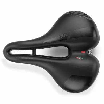 Cette selle de vélo noire est proposée en taille Medium. Elle mesure 218 x 255 mm (large x longueur) pour un poids de 560 g. C’est un modèle unisexe qui convient aux deux morphologies féminine et masculine et plus particulièrement à une largeur d’ischions de 9 à 14 cm (soit du XS à du XL en taille de pantalon).
